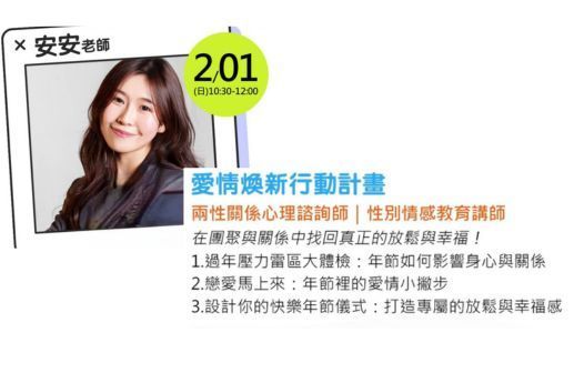 【陳奕安老師】課程名稱:愛情煥新行動計畫副標說明:新年就從感情斷捨離開始,整理舊劇本、看見新可能,替自己開啟一場全新的愛情心冒險!...